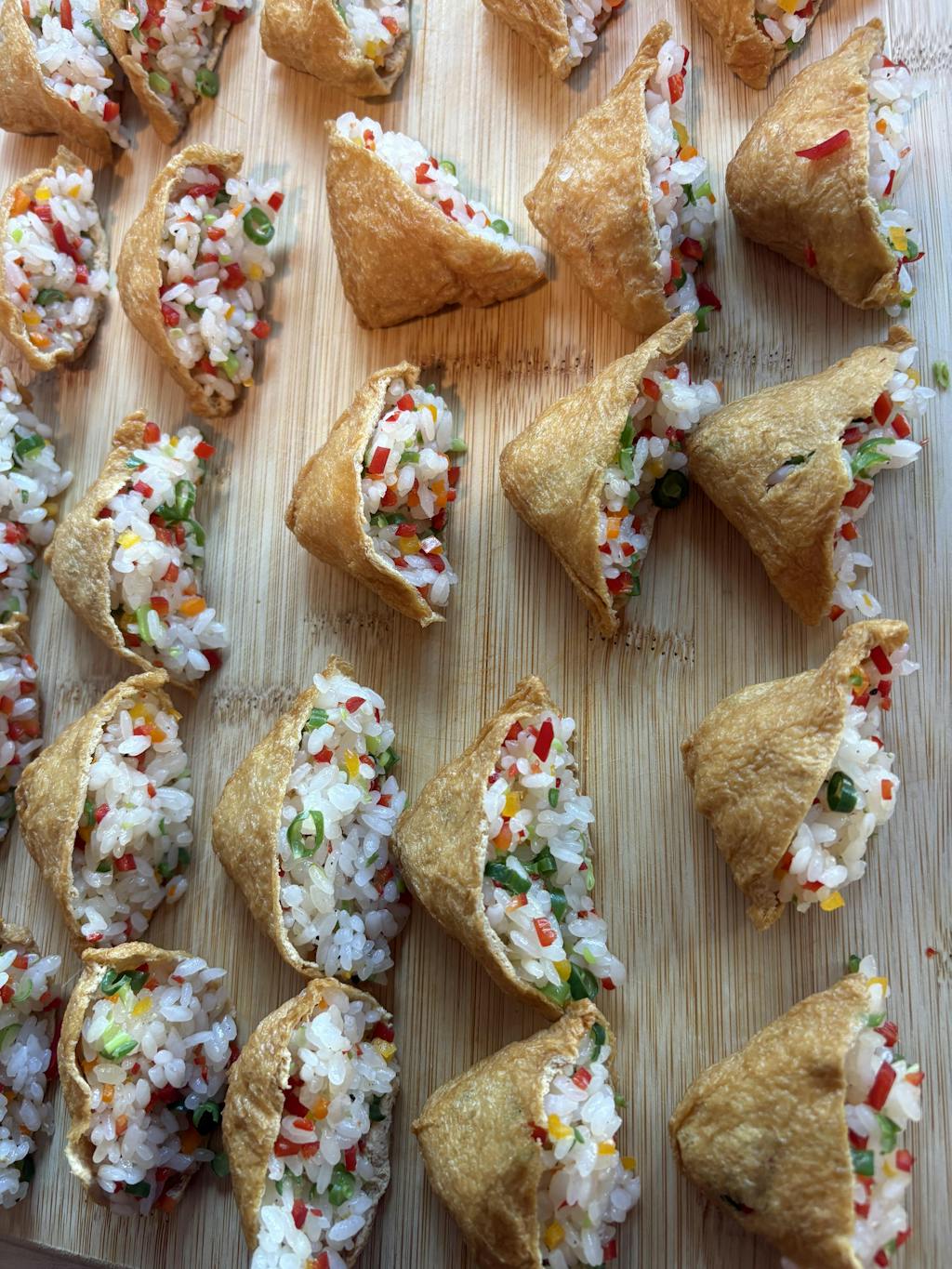 유부피를 조심스럽게 펼쳐 준비한 밥을 적당량 채웁니다.