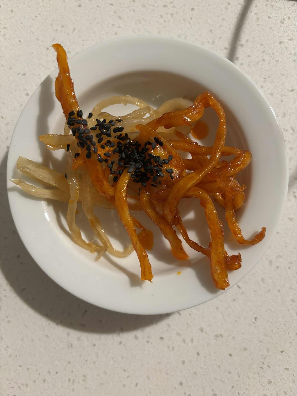 Chewy seasoned dried squid meets a savory and mild soy sauce marinade to create a side dish anyone can enjoy with ease.