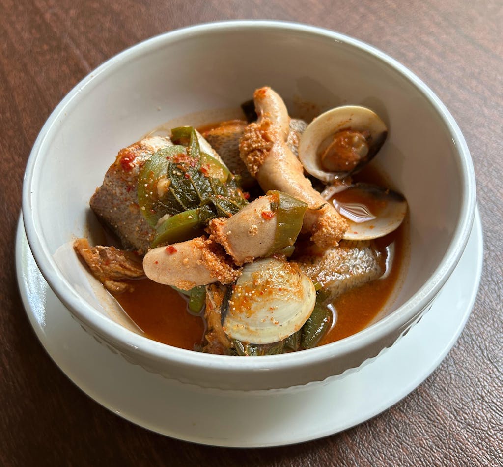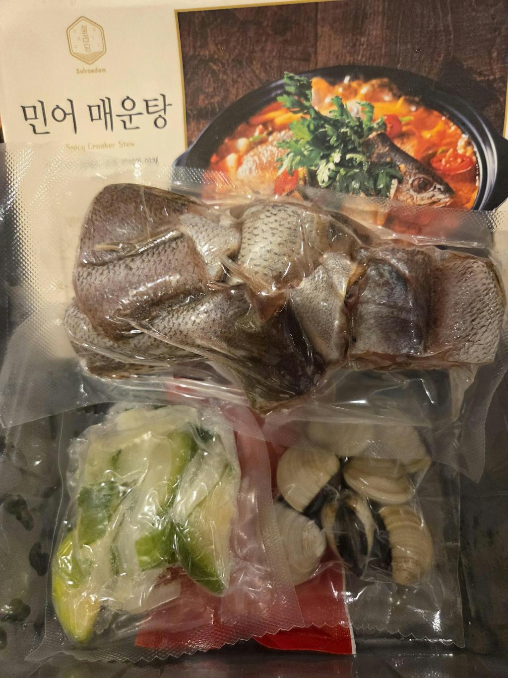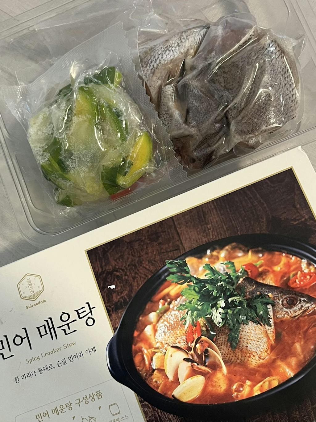 Spicy stew mealkit that contains fresh croaker, vegetables, clams and deep spicy sauce!