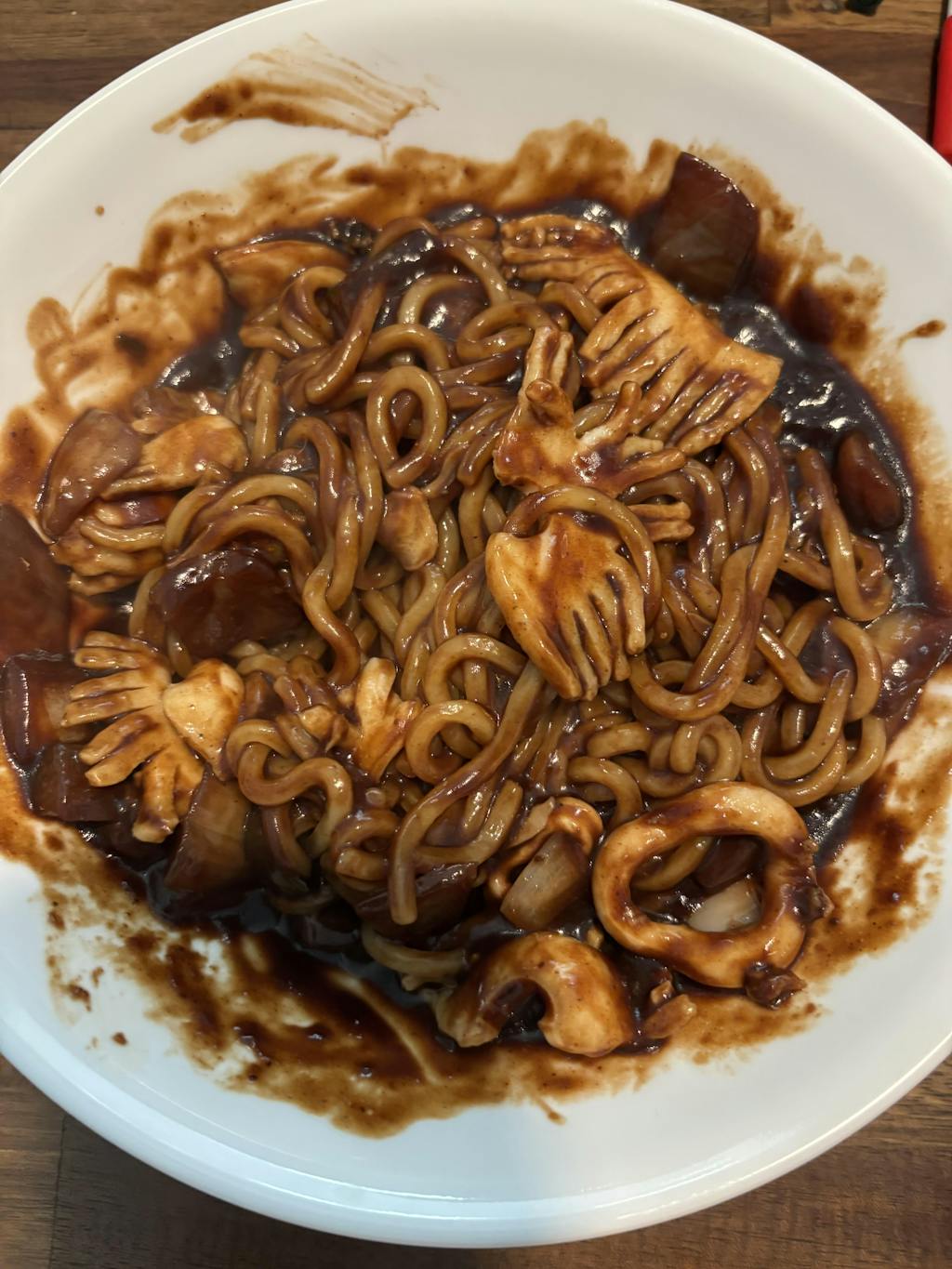 반 건조라서 버터에 고소하게 구워서 먹을 수도 있고, 찌개에도 넣어서 먹을 수 있고, 오늘은 남편이 어디서 본건 있어서이연복 짜장에다 예쁘게 칼집내서 오징어 삼선 짜장을 해 먹더라구요.