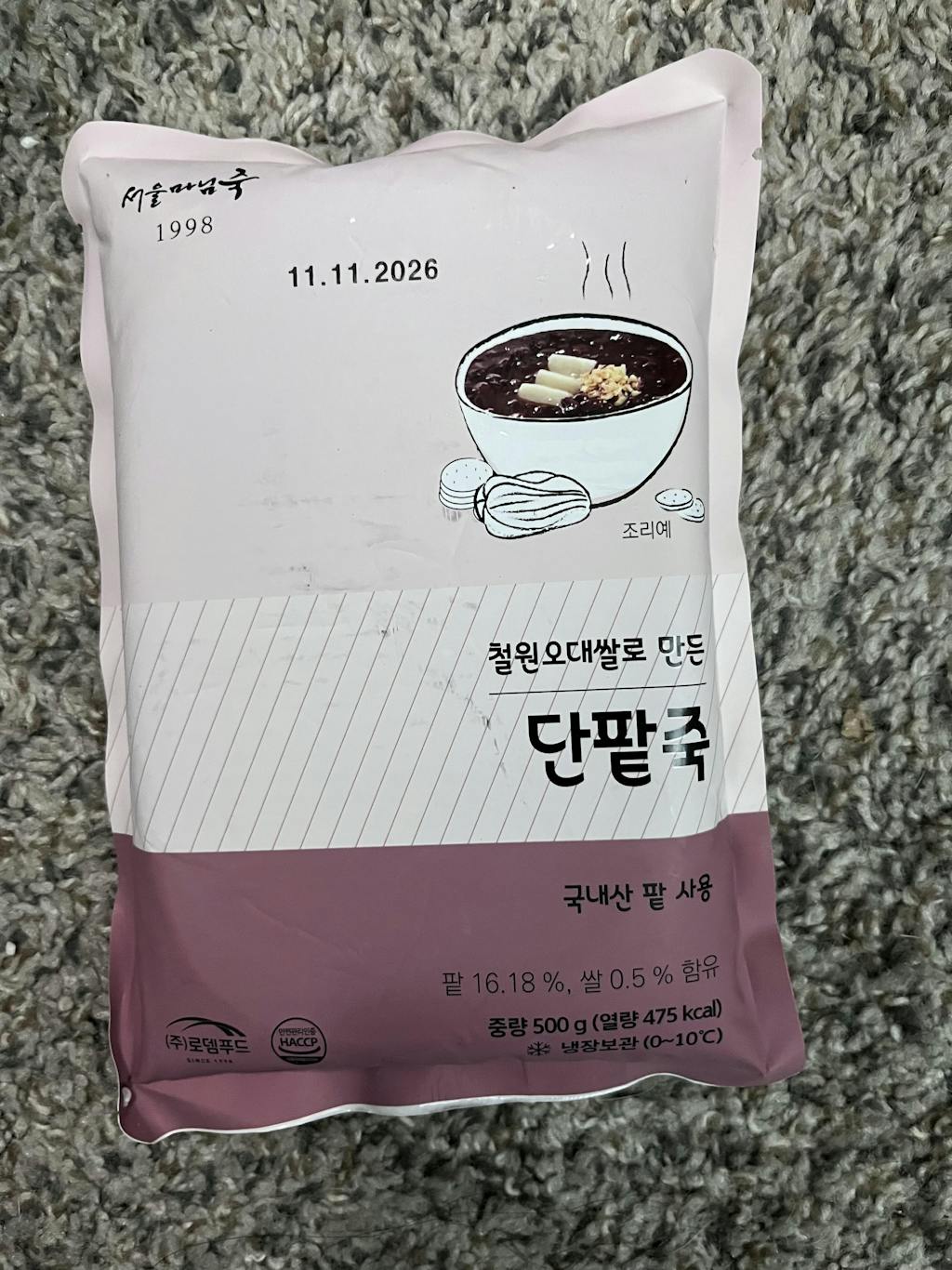 | Ingredients | Purified water, red bean (domestic), sugar, starch syrup, modified starch, rice (domestic), glutinous rice (domestic), sea salt (domestic) |